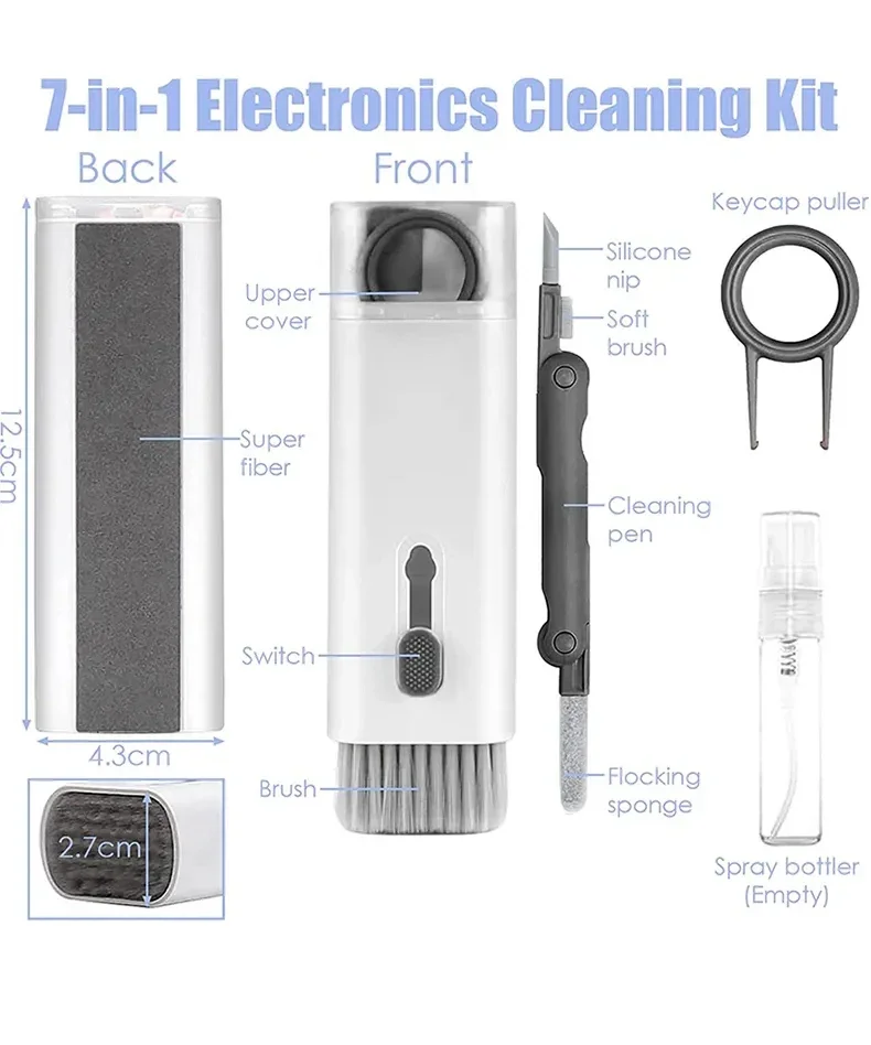 Keep your gadgets and electronics spotless with this 7-in-1 cleaning kit, specially designed for Bluetooth earphones, headphones, mobile phones, tablets, computers, cameras, and other digital devices. Perfect for home, office, or travel use, it provides everything you need to maintain your devices clean and dust-free.
