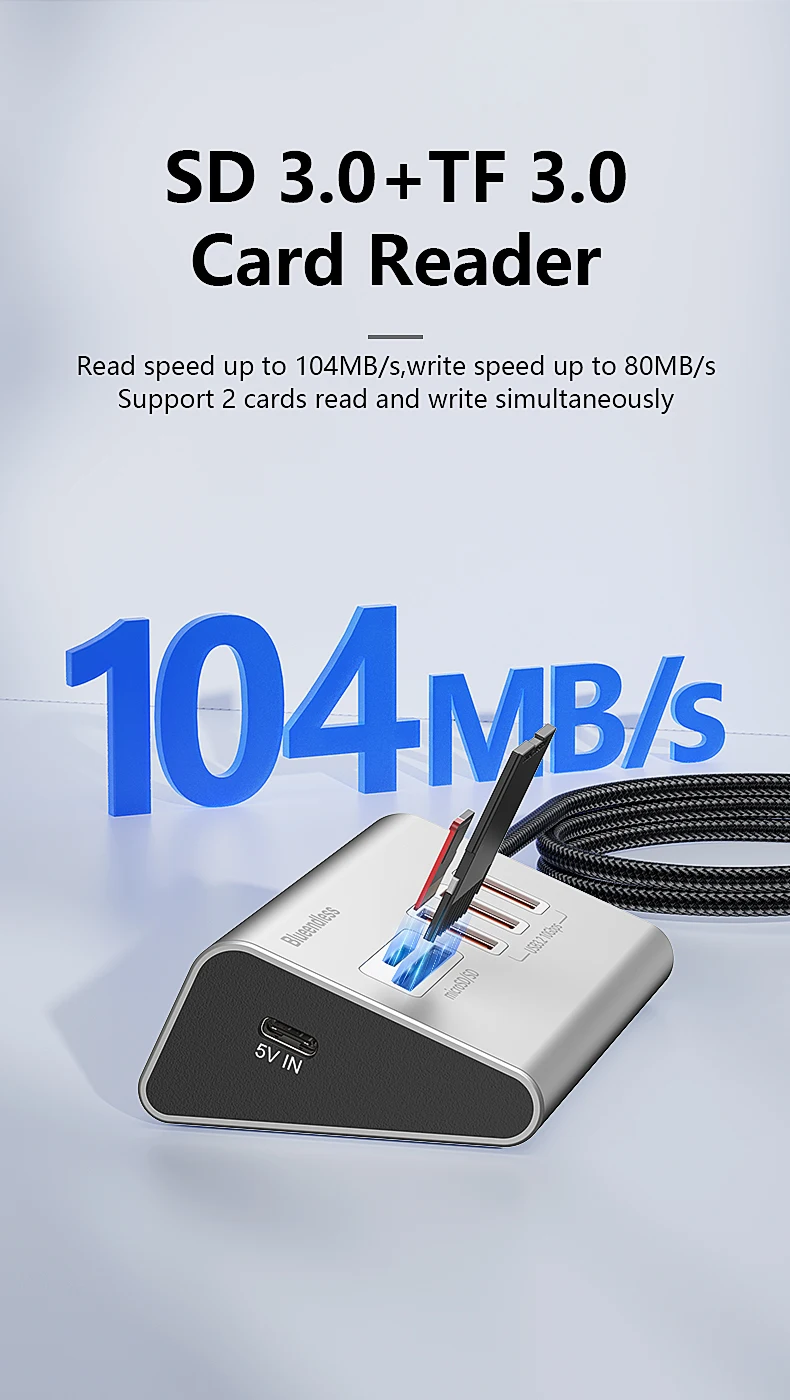 - SD + TF 3.0 Card Reader: 104MB/s, supports simultaneous read/write of 2 cards