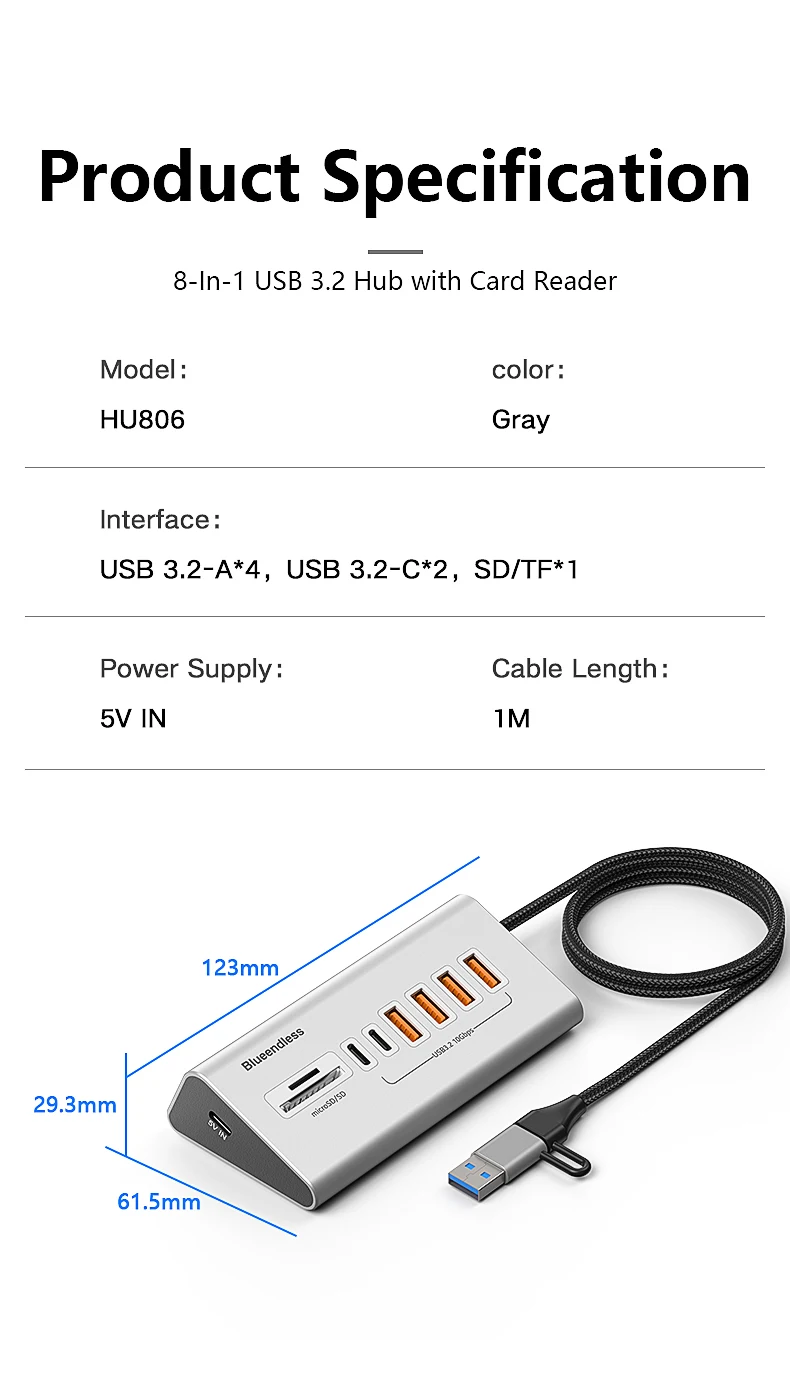 ⚡ HU506 – 5-in-1 USB 3.2 Gen2 Hub with SD/TF Card Reader