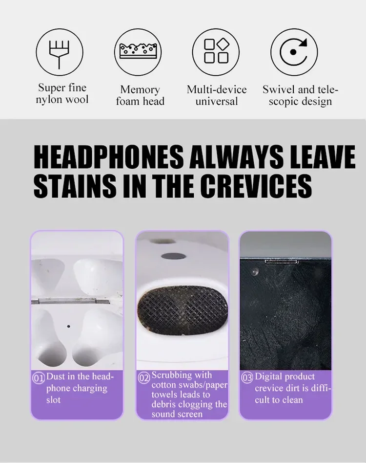 • Effectively cleans earbuds, charging cases, and hard-to-reach crevices.