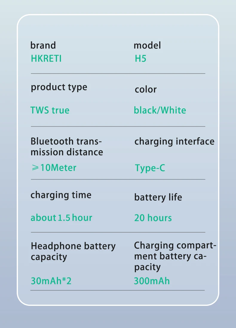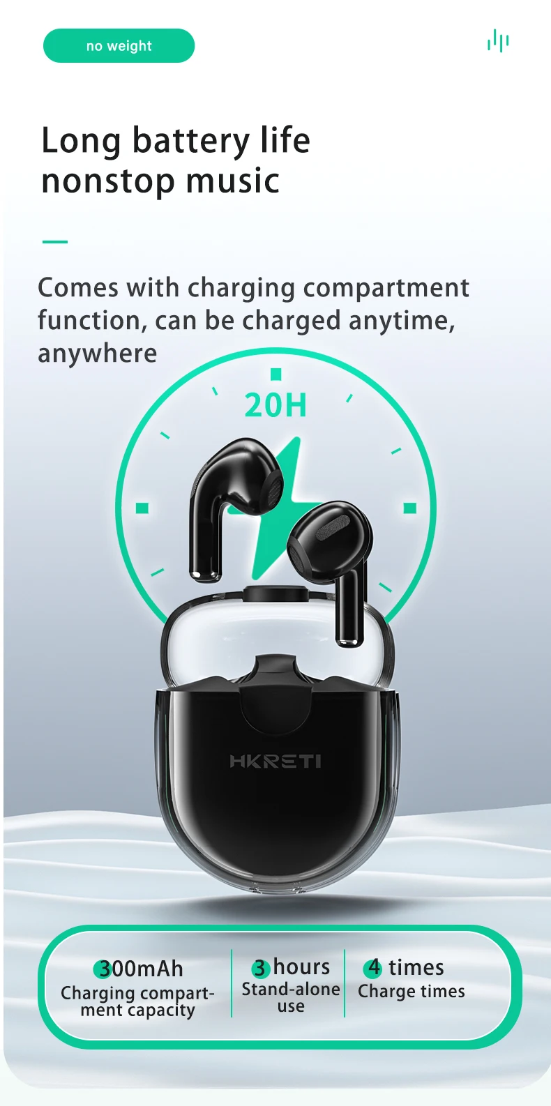 Experience the perfect balance of performance and durability with the HKRETI H5. Featuring Bluetooth 5.4 and an impressive 5-hour battery life, these earbuds are built for those who need music all day long.